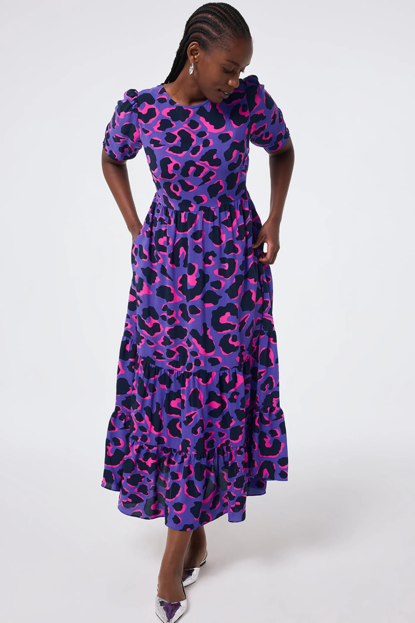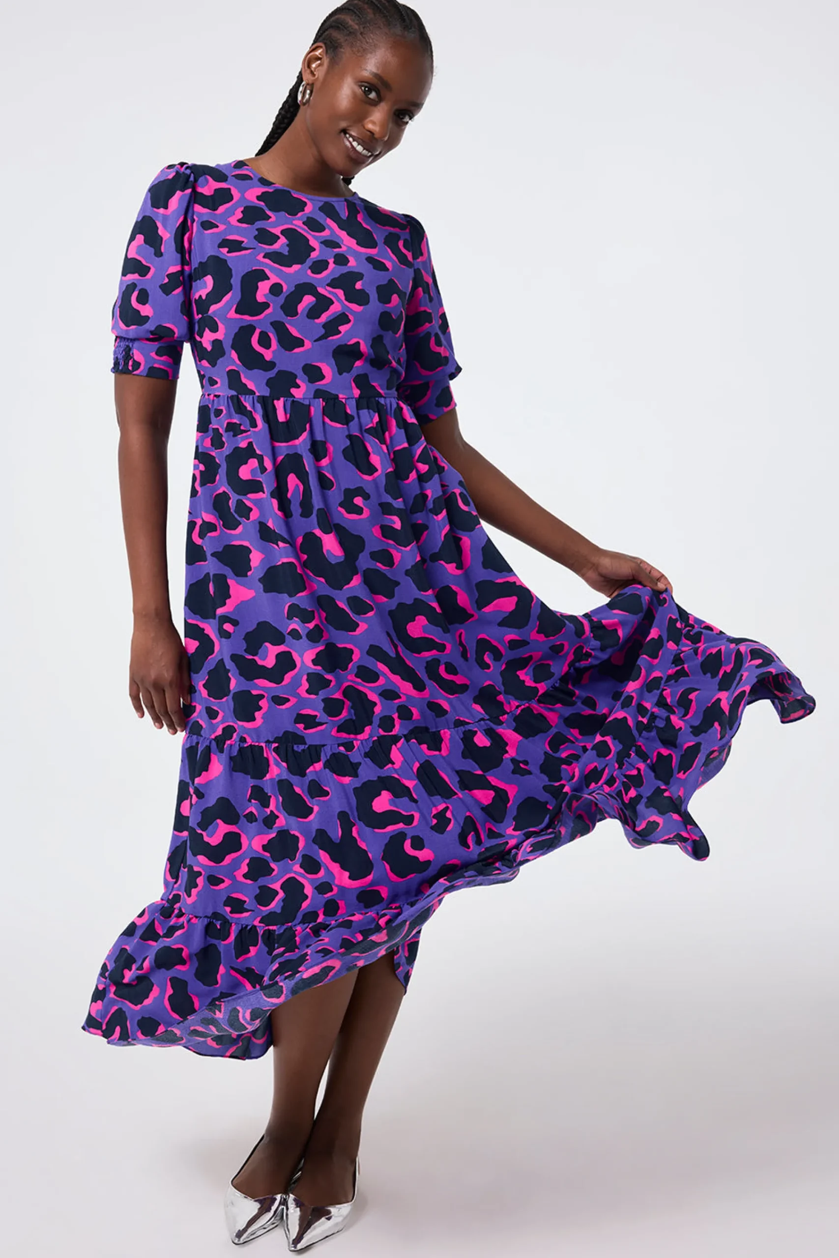 Our purple maxi dress with pink, black snow leopard and lightning bolt print is a flattering and versatile style and is perfect for nailing your weekday and off-duty look at the switch of your shoes.