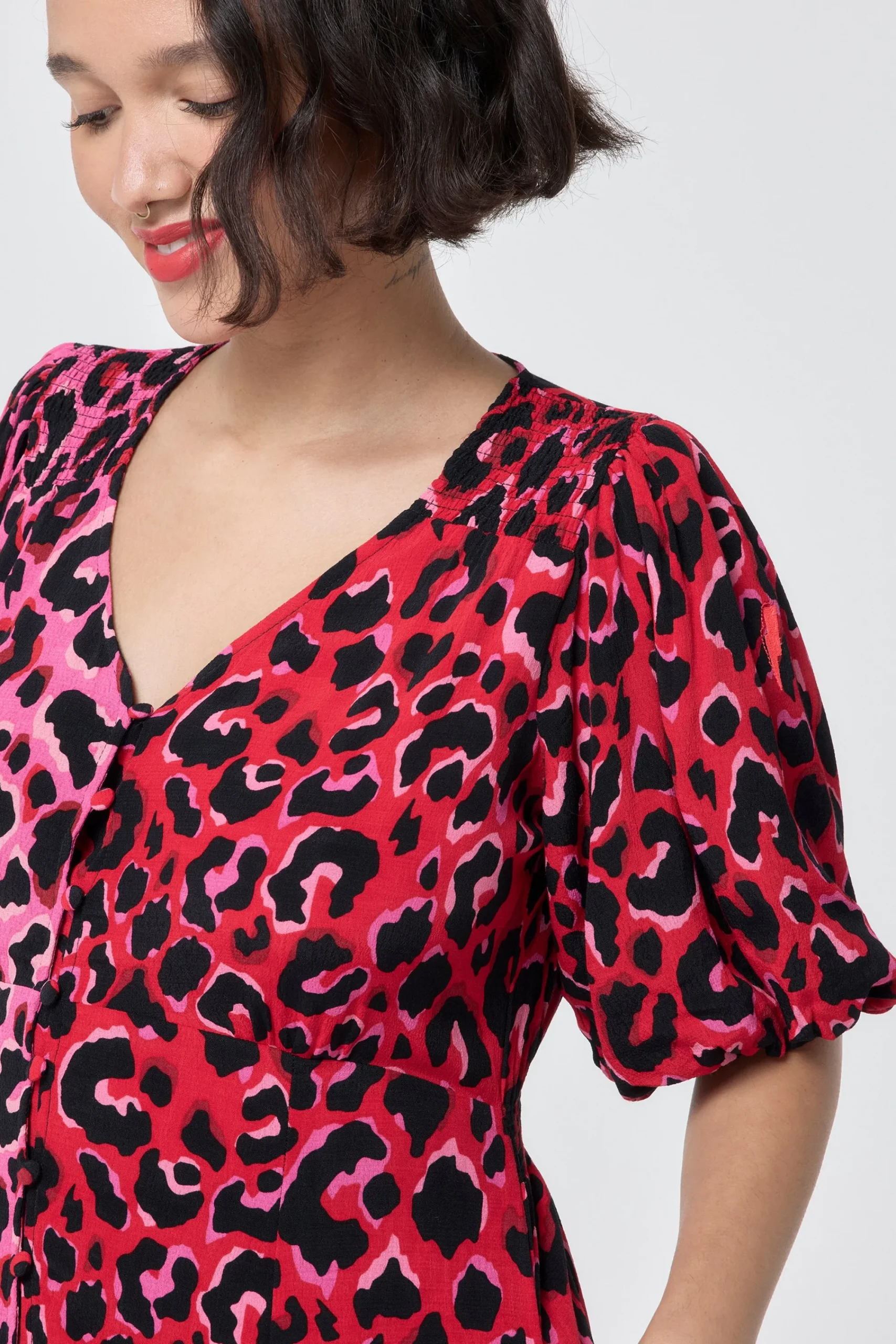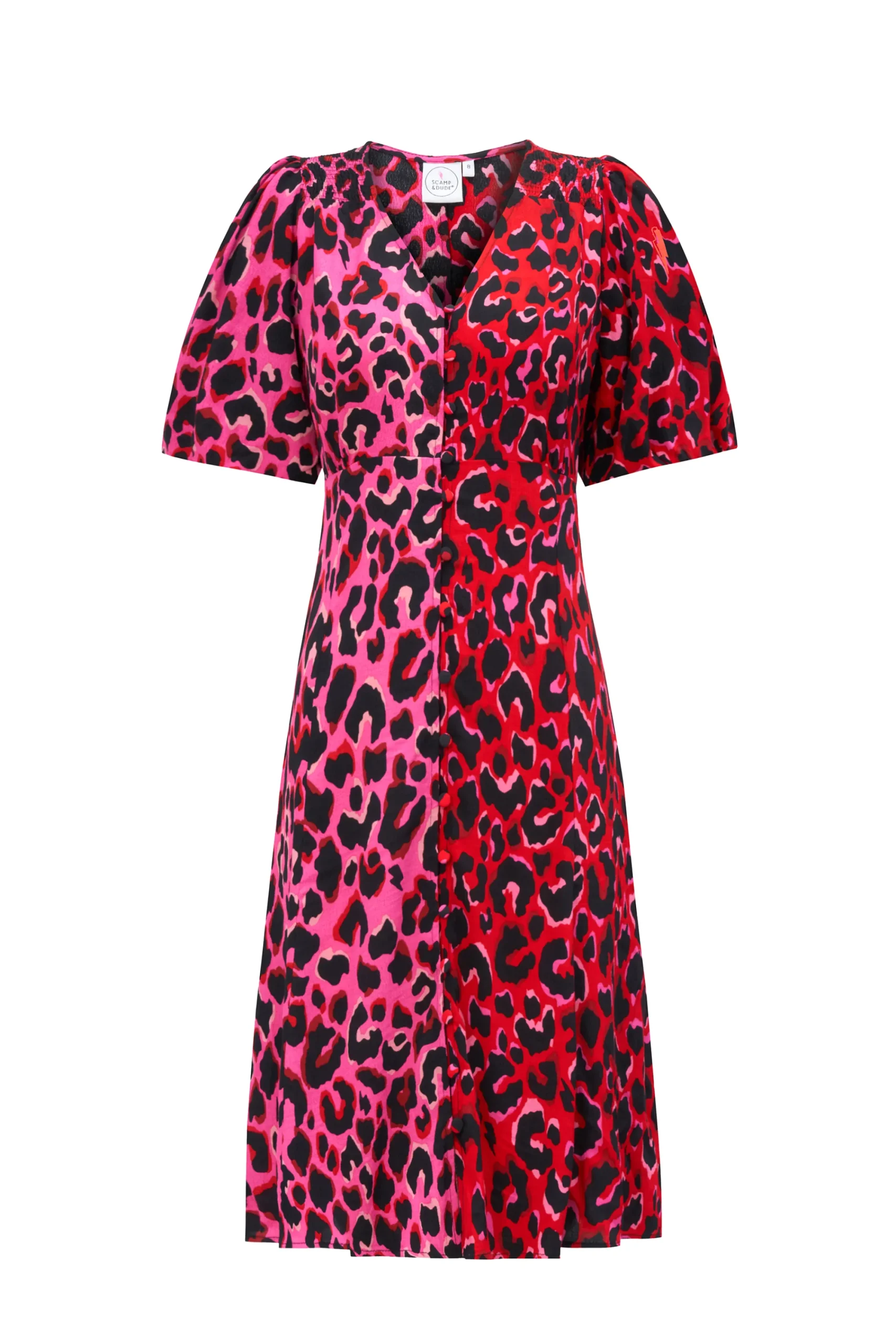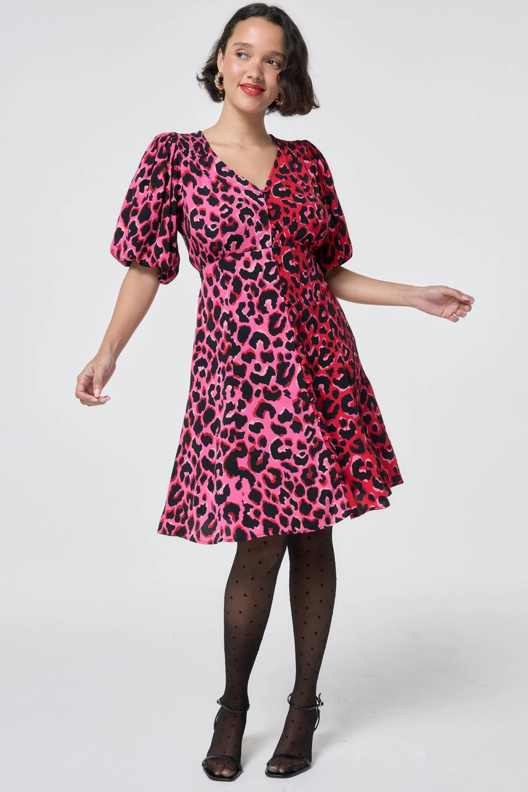 Feel confident in our red with pink and black mix and match leopard and lightning bolt tea dress. Featuring a timeless v-neck, short puff sleeves and cut to a mini length, style yours for the day with trainers or evening plans with heels.