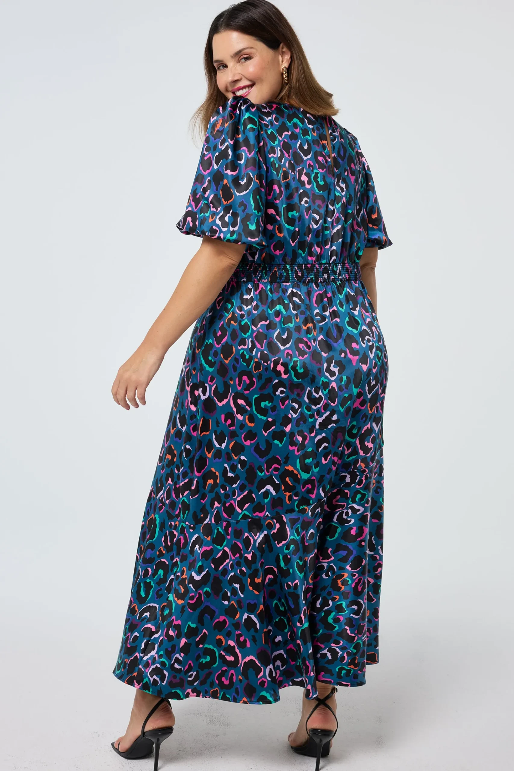 Bold and beautiful, this teal with rainbow shadow leopard and lightning bolt midi dress will make a joyful addition to your wardrobe. Made in a soft satin fabric, the midi length dress features a peplum hem skirt and short puff sleeves.