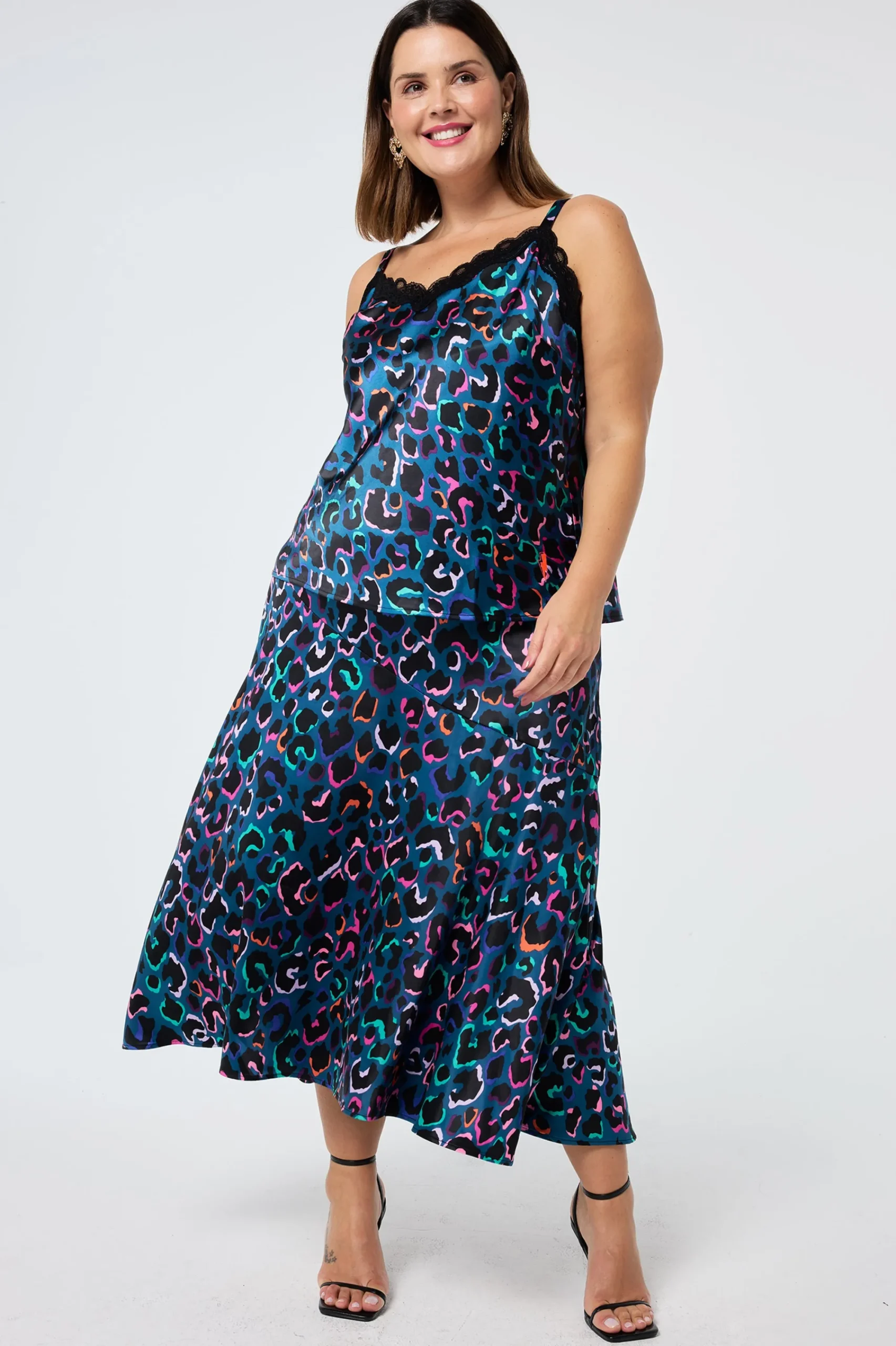 Spruce up your skirts collection with this teal with rainbow shadow leopard high low skirt, it’s a statement making pick that can be dressed up or down. It’s made from soft satin and designed with an elasticated waist on the back for easy comfort.