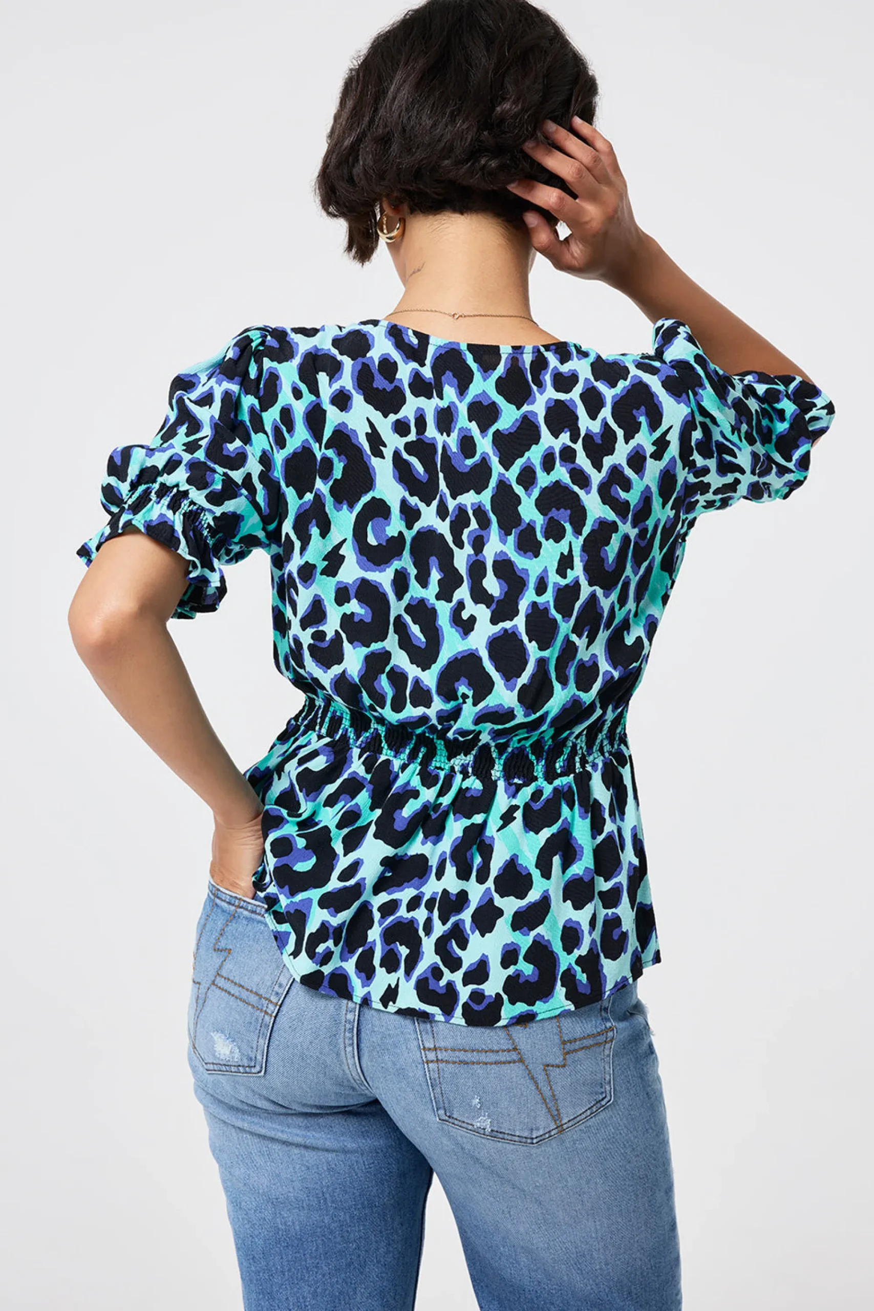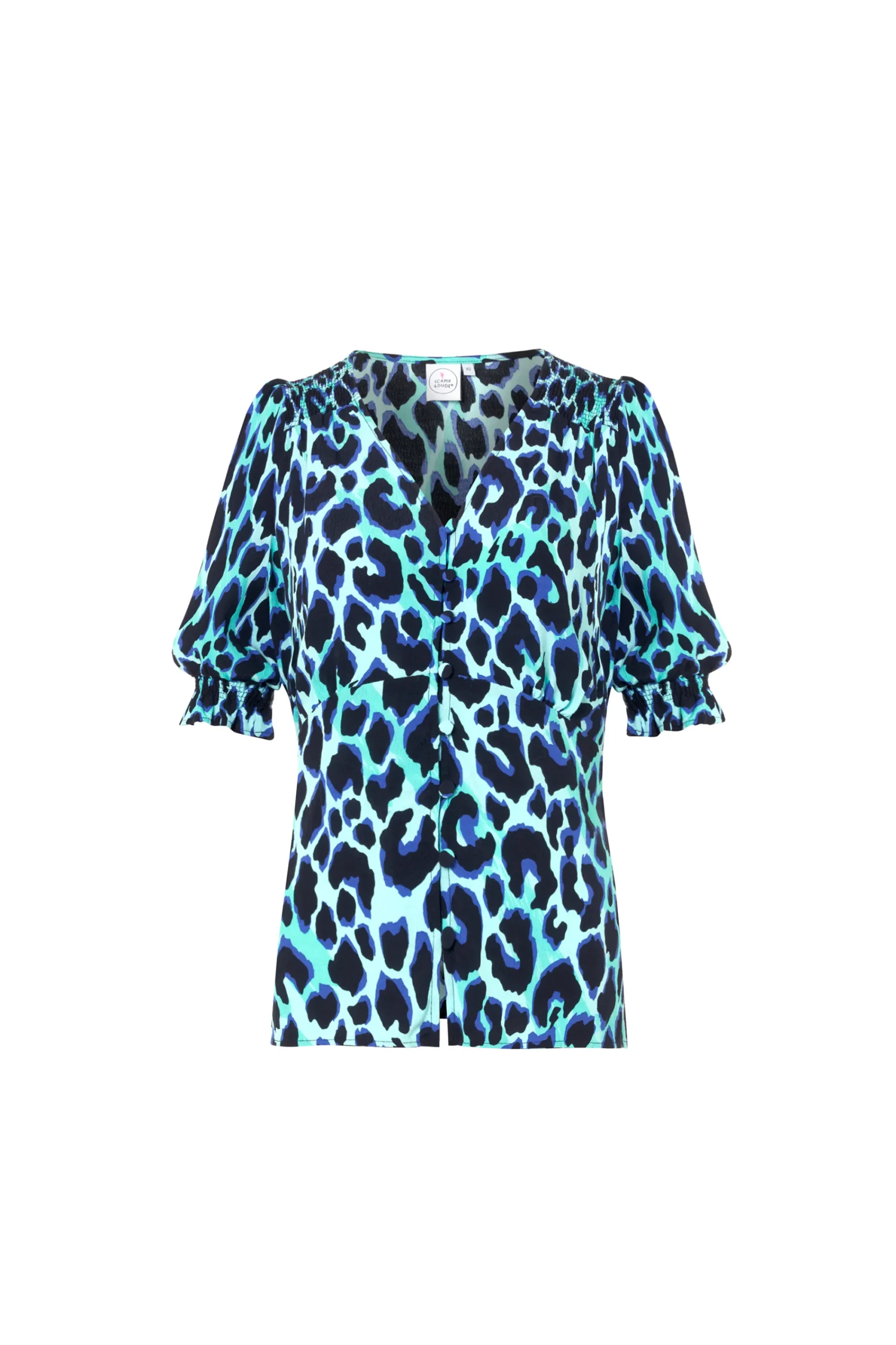 Make our turquoise with black and blue shadow leopard and lightning bolt print button through blouse your go-to for every plan. The mood-boosting print looks great teamed with Scamp & Dude denim.