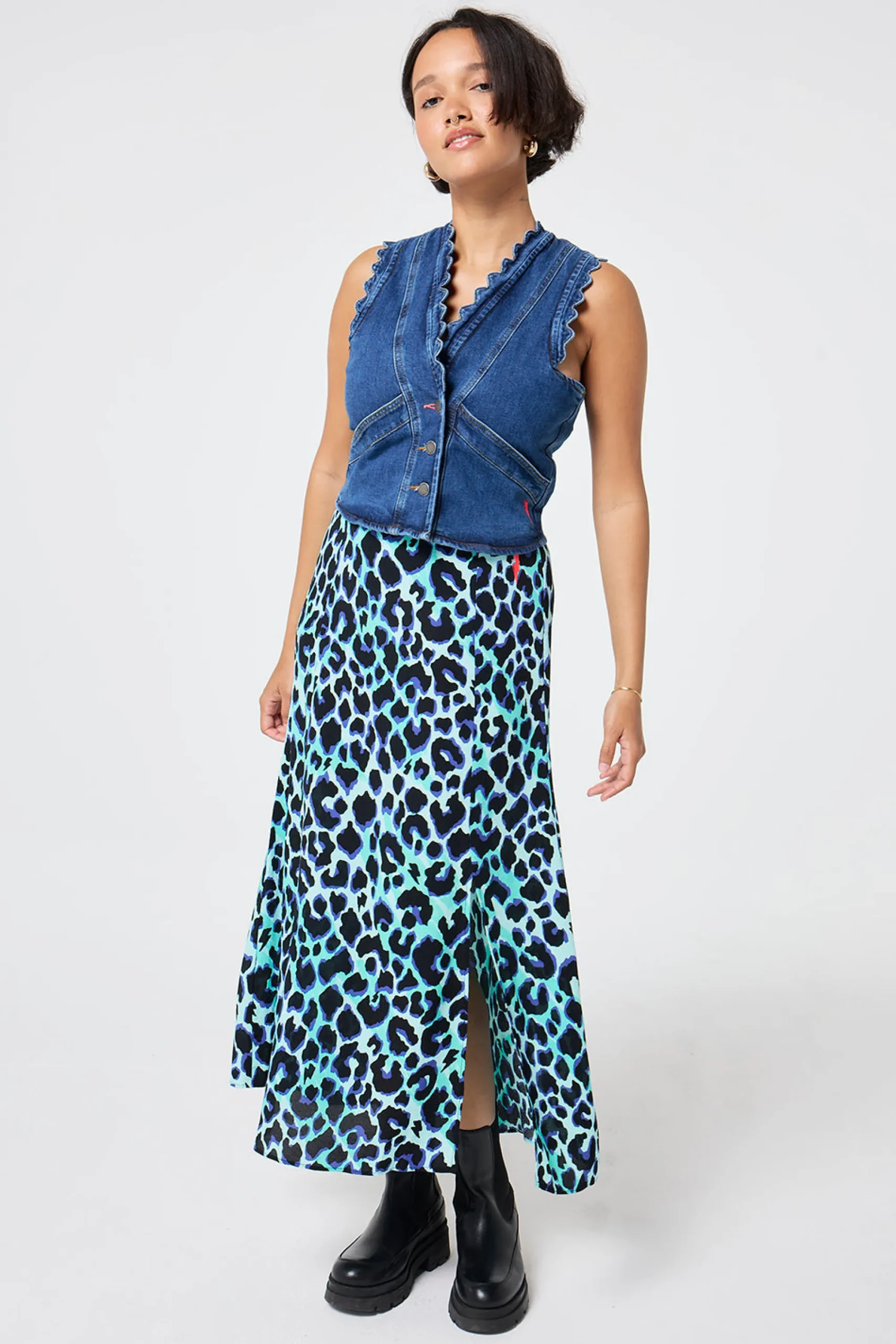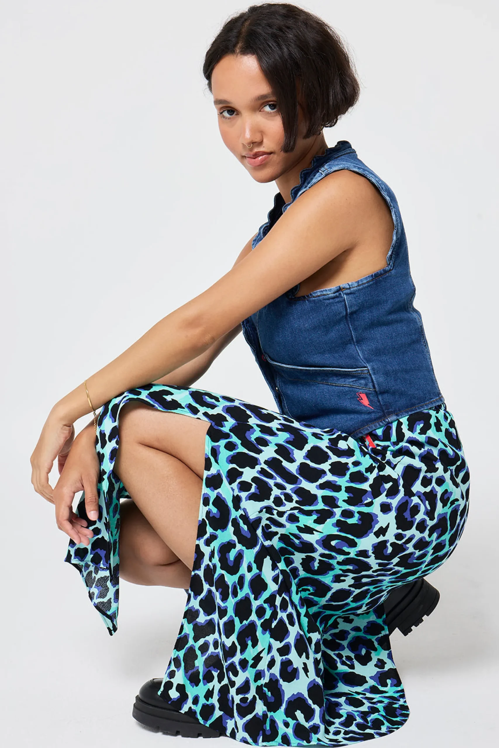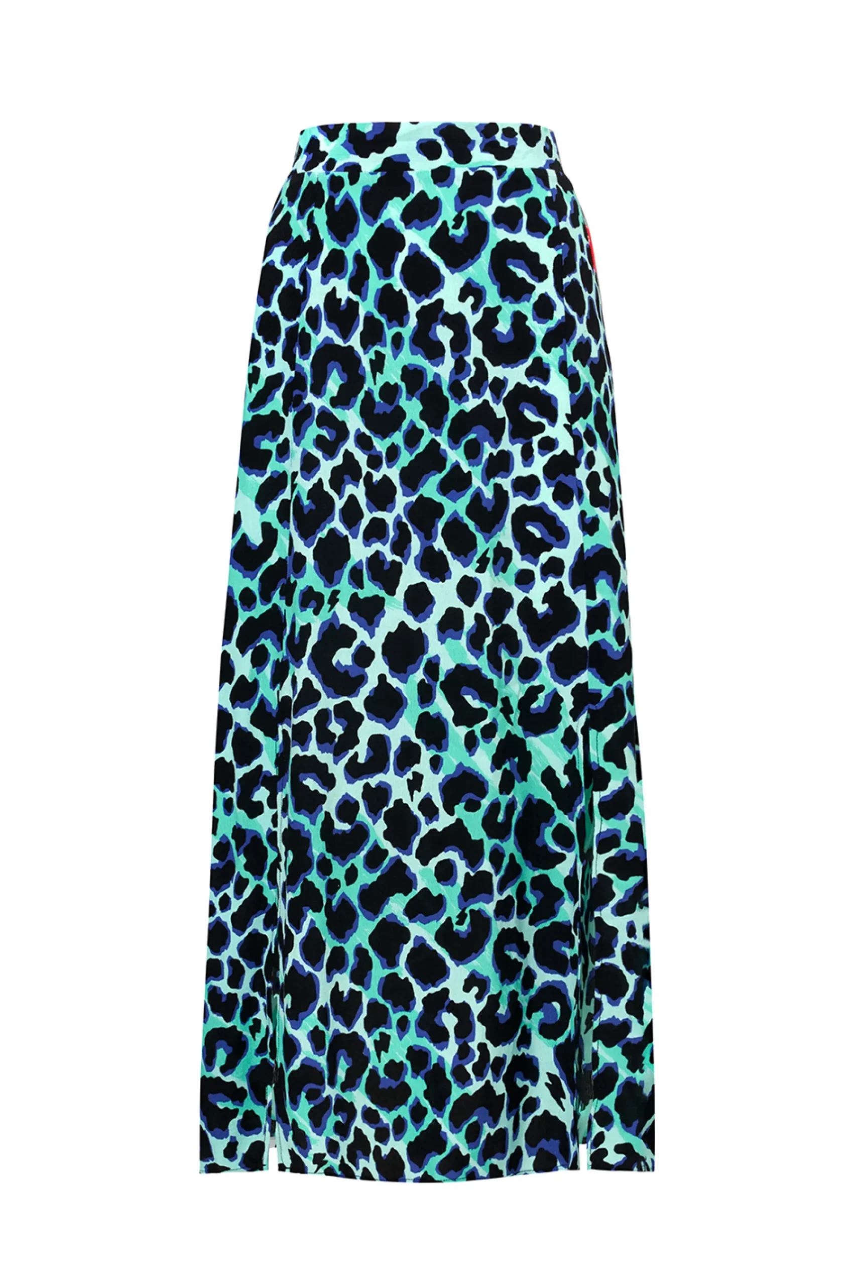 Our turquoise with black and blue shadow leopard and lightning bolt print split front skirt is a statement making pick that can be amped up for special occasions or pared back with a t-shirt and sandals. It’s designed with an elasticated waist on the back for easy comfort.