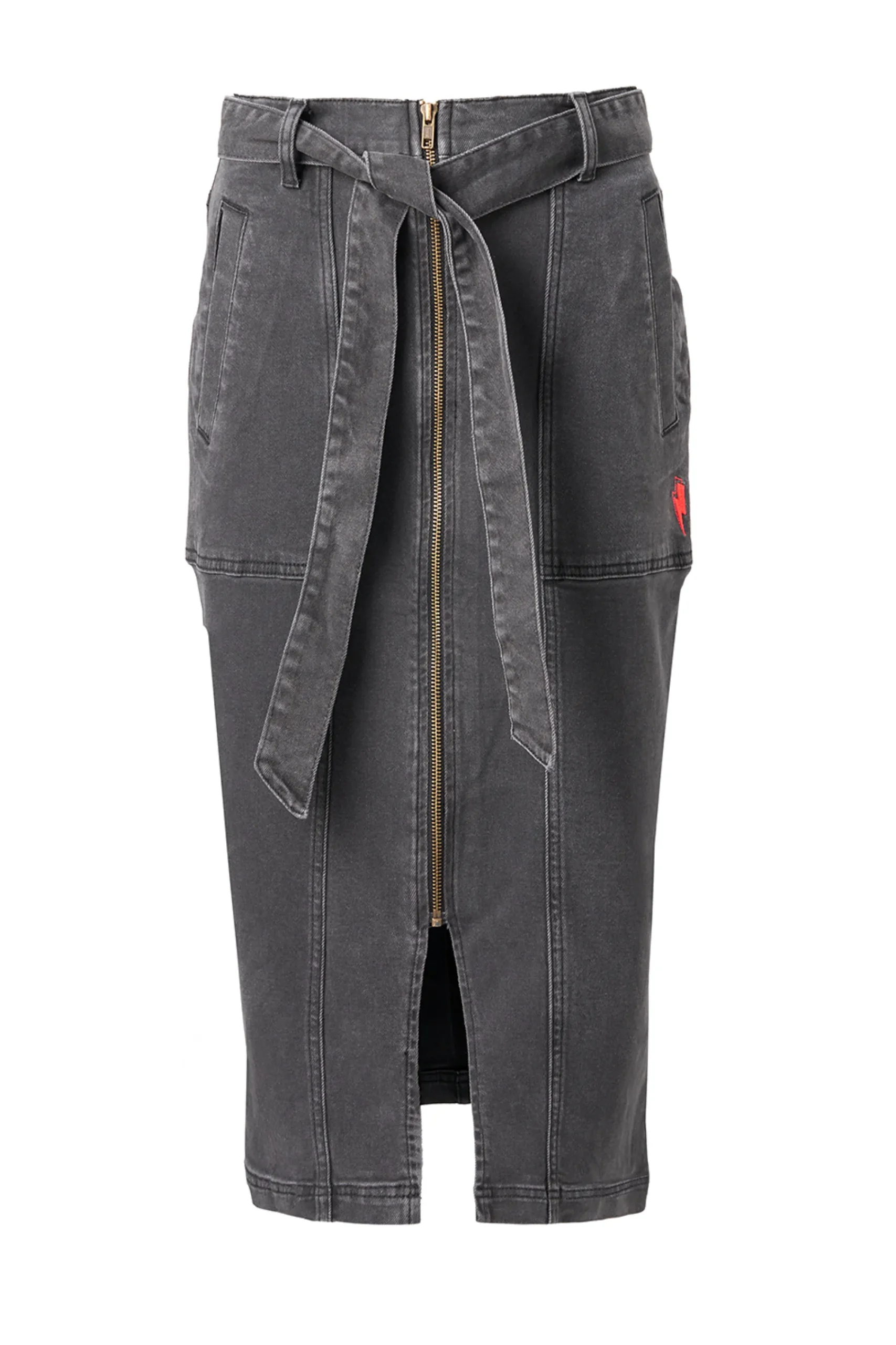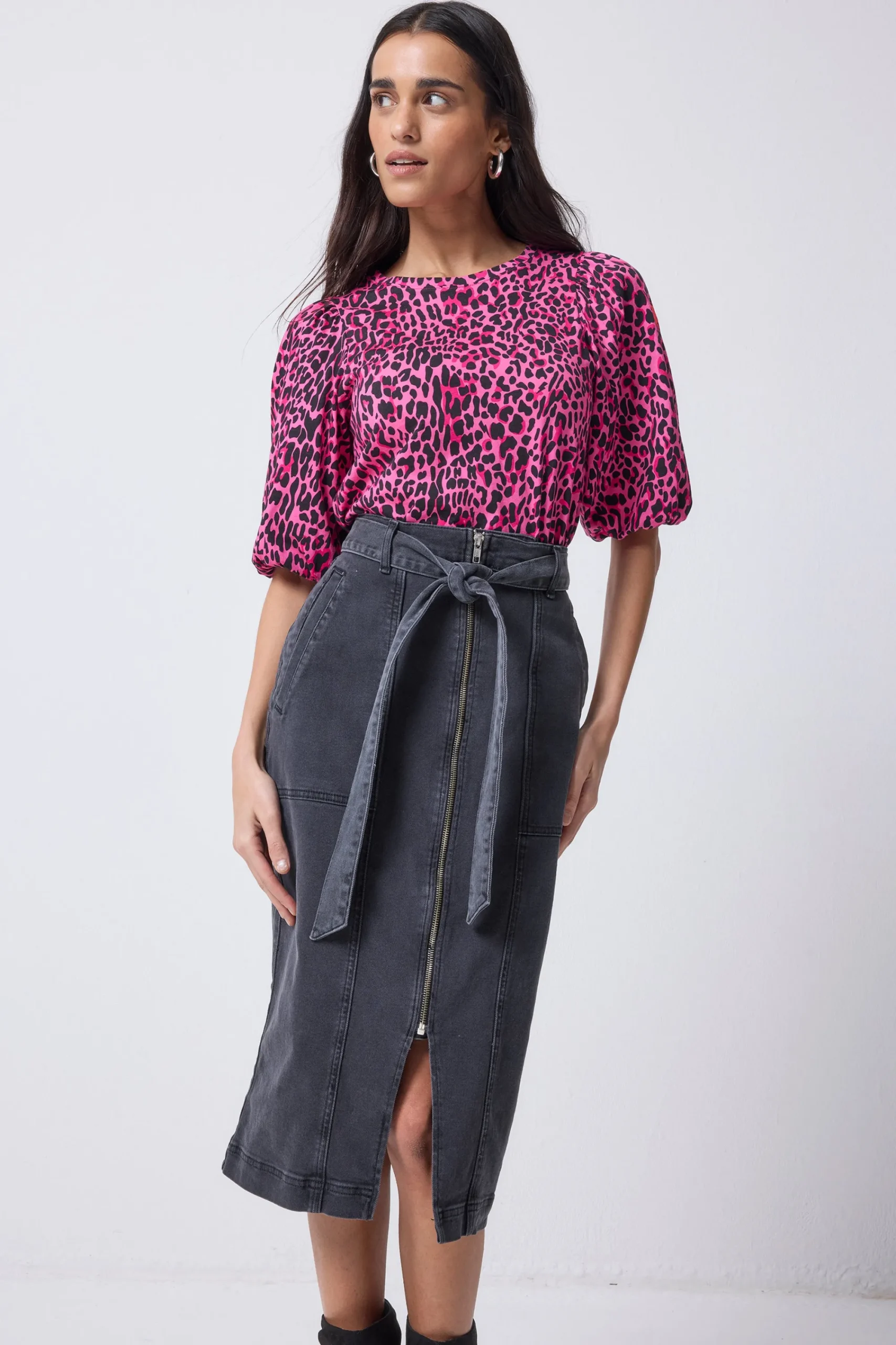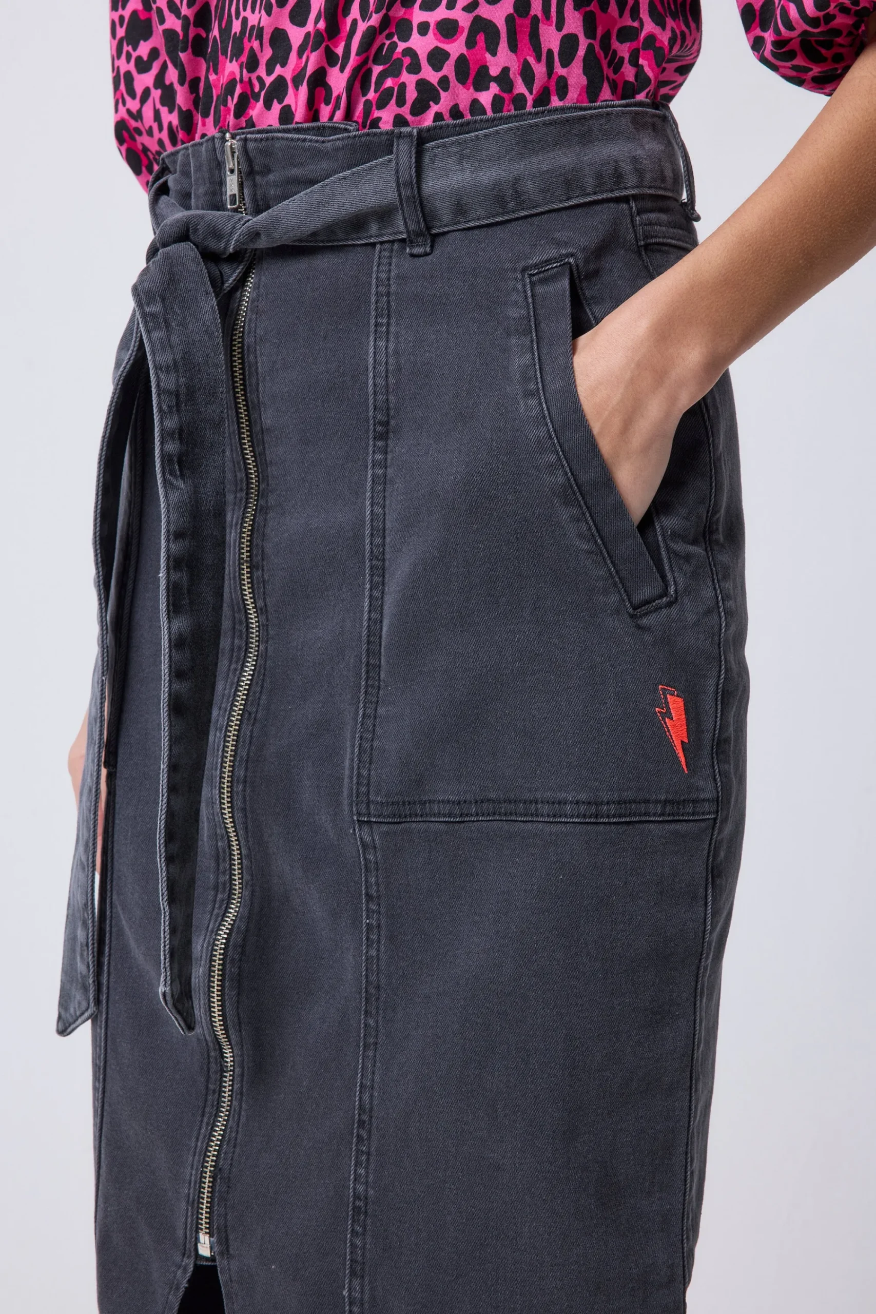 This washed black denim zip detail denim midi skirt is the hero piece of the season – A cool alternative to jeans, with a split at the center front for a flash of leg and easy movement. It’s a versatile piece which cinches you in at the waist. Pair with a tee and cardigan or knitted jumper and your favourite trainers for a laid back, stylish look.