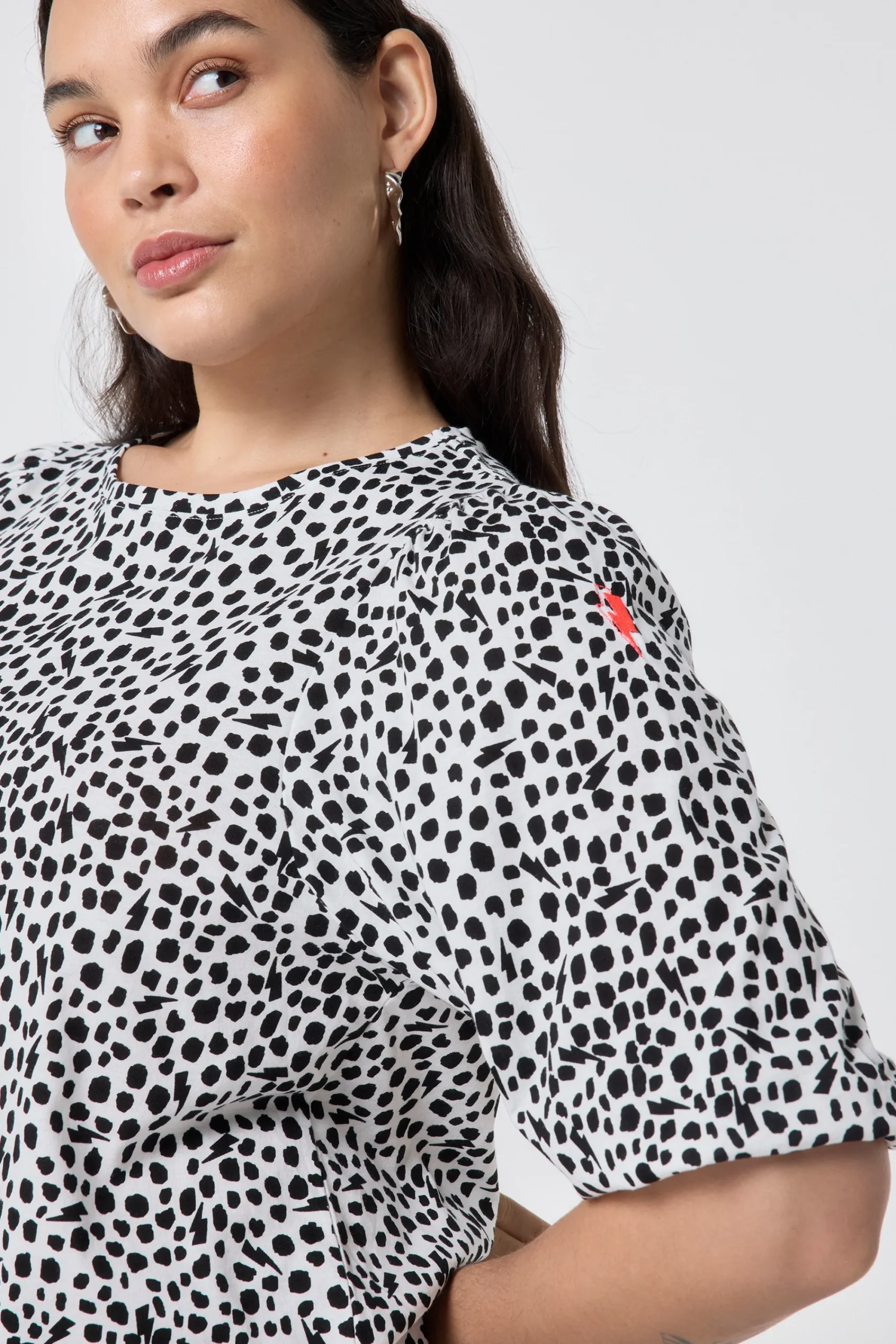 Make a statement in our white with black cheetah and lightning bolt puff sleeve T-shirt. Complete with a crew-neckline and feminine puff sleeves with an elasticated cuff, this comfortable piece will be the perfect addition to your wardrobe. We’ll be pairing ours with dark denim and trainers for a casual yet stylish outfit.