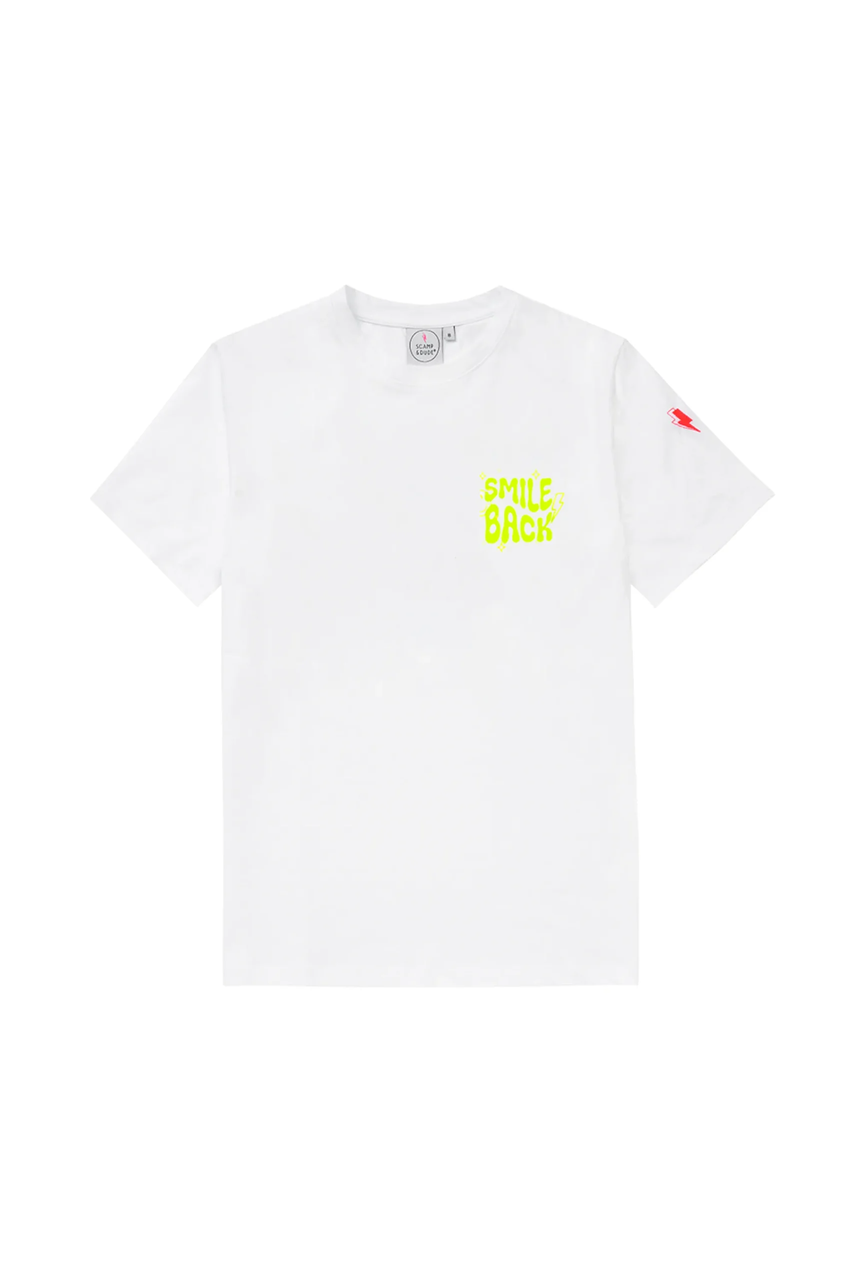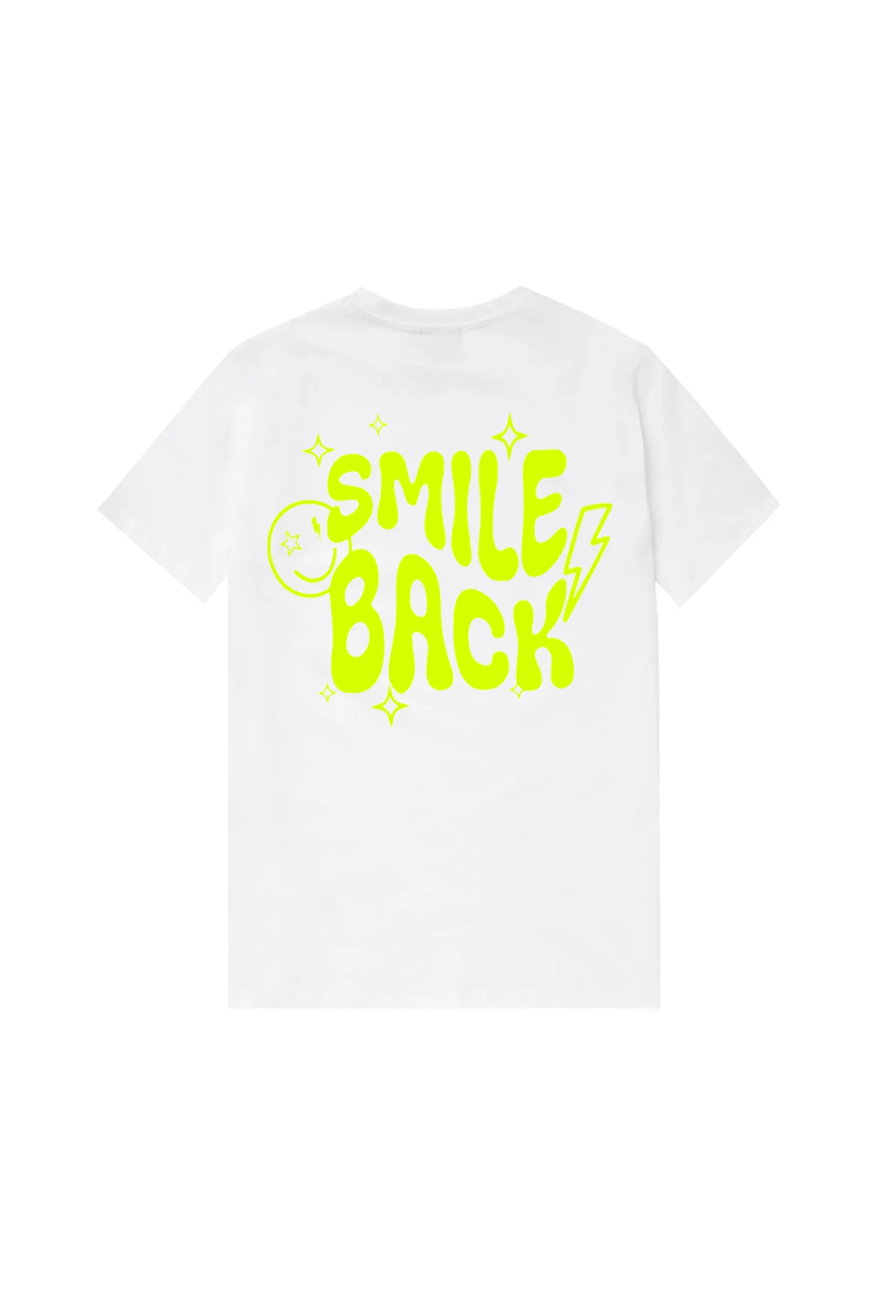 Our white T-shirt with neon yellow smile back slogan will become your off-duty staple. It’s stylish, comfy and filled with superpowers. Please note, the yellow on this tee is a little camera-shy. It’s a true, vibrant neon and pops in real life. Enjoy!